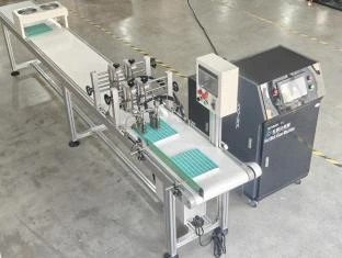 (1) لصق المنتجات التلقائي: يحدد PLC طول الغراء وفقًا لطول المنتج ، ويتم وضع المنتج ونقله ، ويتم استشعار المنتج بواسطة مسبار كهروضوئي للتلوين ، وتبريد الهواء ، والإخراج.